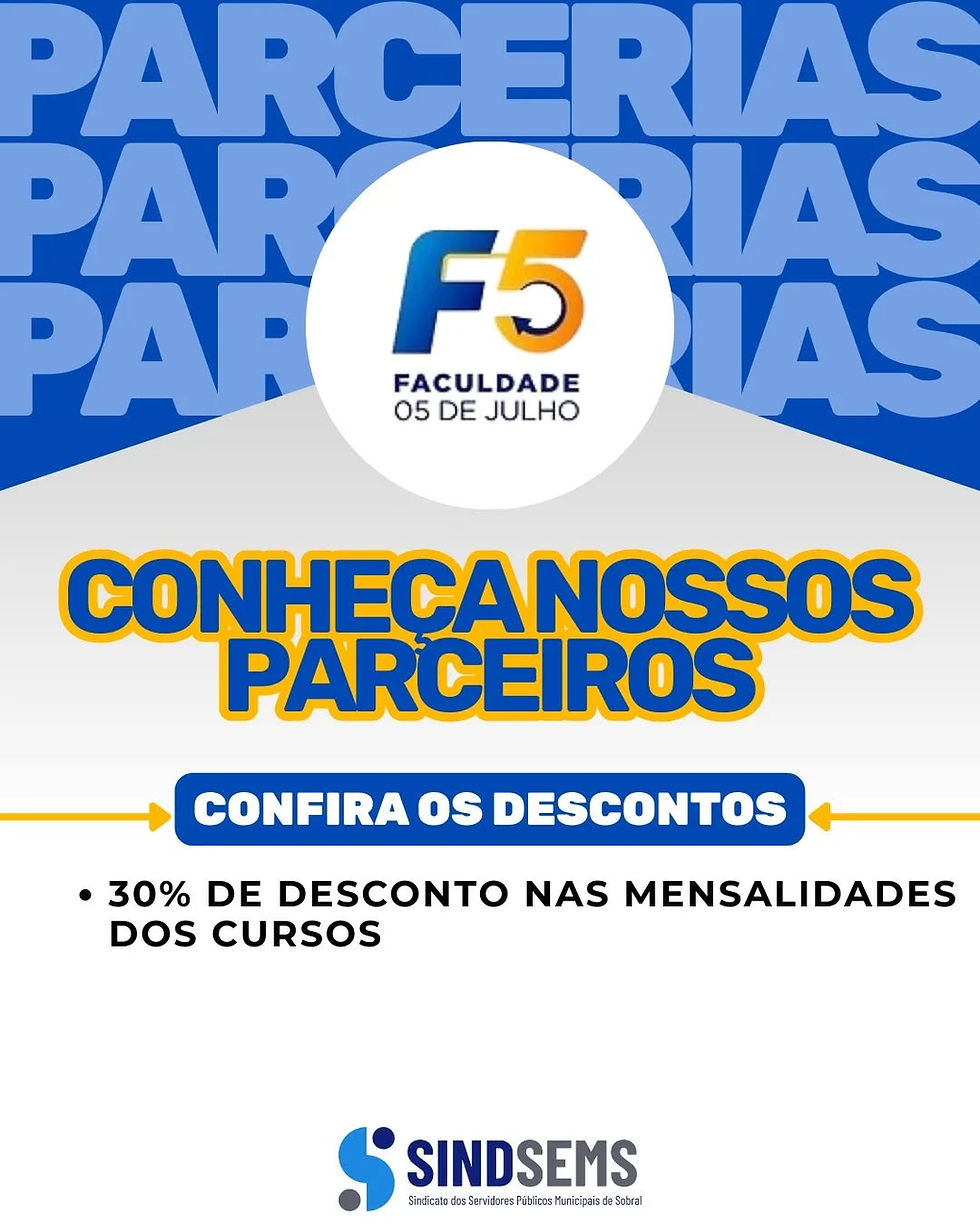 O Sindsems mantém parceria com a Faculdade 05 de Julho (F5), assegurando aos seus filiados 30% de desconto nas mensalidades dos cursos ofertados pela instituição. A iniciativa integra a política de convênios do sindicato, voltada à ampliação de oportunidades educacionais para os servidores municipais.